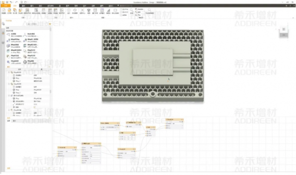 VDA的設(shè)計(jì)模塊VoxelDance Design(VDD)基于隱式建模技術(shù),可以快速實(shí)現(xiàn)基于數(shù)學(xué)公式、函數(shù)、有限元分析結(jié)果等參數(shù)驅(qū)動(dòng)式設(shè)計(jì)。因此在設(shè)計(jì)零件時(shí),通過手動(dòng)添加流程節(jié)點(diǎn)變化參數(shù),即可精準(zhǔn)實(shí)時(shí)地體現(xiàn)TPMS結(jié)構(gòu)的填充。對比傳統(tǒng)軟件來說,VDD不僅可以快速優(yōu)化設(shè)計(jì)流程,還大幅度降低了設(shè)計(jì)時(shí)間,使設(shè)計(jì)師的想法實(shí)時(shí)得到表達(dá)。此外,VoxelDance Design還支持使用非線性參數(shù)對零件特征尺寸進(jìn)行快速驅(qū)動(dòng),允許設(shè)計(jì)師在設(shè)計(jì)過程中對零件特征進(jìn)行更精細(xì)、復(fù)雜的調(diào)整,精確控制零件的表面曲率、幾何形態(tài)或其他物理特性。