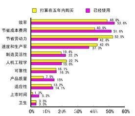 某知名行業(yè)媒體進(jìn)行的包裝機器人的調(diào)查顯示,目前使用機器人的用戶49.5%和不使用機器50.5%幾乎平分秋色。但在未來五年里,這種情況可能會發(fā)生急劇變化,沒有使用機器人的企業(yè)中,有46.7%的企業(yè)表示,他們在未來五年內(nèi)有購買機器人的計劃。其中影響企業(yè)購買機器人的因素主要集中在效率、節(jié)省成本費用和節(jié)省勞動力三個方面。