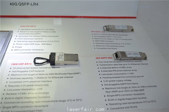 易飛揚通信展出40G QSFP120G CXP可插拔光模塊。易飛揚稱將重點推進(jìn)數(shù)據(jù)中心市場,今年其10G/40G數(shù)據(jù)中心產(chǎn)品已經(jīng)實現(xiàn)規(guī)?;N售。