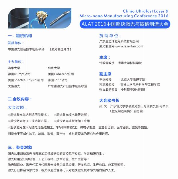 會議方向ALAT 2016中國超快激光與微納制造大會將包含4個主題:(1)超快激光微納制造研究新進展;(2)激光微加工應(yīng)用新進展;(