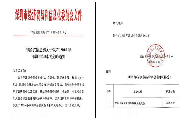 近期,深圳市經(jīng)濟(jì)貿(mào)易和信息化委員會(huì)發(fā)布了2016年深圳市品牌展會(huì)的通知。中國(guó)(深圳)國(guó)際觸摸屏展覽會(huì)(深圳國(guó)際全觸與顯示展)正式被深圳市經(jīng)濟(jì)貿(mào)易和信息化委員會(huì)認(rèn)定為品牌展會(huì)。
