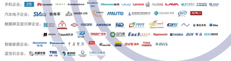 藍(lán)思、天馬、深越光電、肖特玻璃、科立視、合力泰、南玻、康得新、帝晶、漢王、環(huán)球同創(chuàng)、奧瑞德、大族激光、泰德激光、盛雄激光、湖南宇晶、上銀、匯川、聯(lián)得、臺(tái)灣恒基、大量科技、東遠(yuǎn)機(jī)械、安達(dá)、蘇州精創(chuàng)、科杰集團(tuán)、創(chuàng)世紀(jì)、RPS、昊志機(jī)電、天行儀器、思瑞測(cè)量、度恩光學(xué)、德莎、歐萊集團(tuán)、漢高、賀利氏、富印、開(kāi)思茂、紗帝、精工油墨、彩皇、十條、PPG、飛耐爾