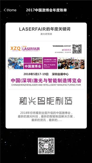 2017年悄然過去,支付寶的年度賬單火爆了朋友圈,這份賬單細(xì)數(shù)著你的點(diǎn)滴,也搭載著2018年的新希望伴您前行。2018中國(深圳)激光與智能制造博覽會(簡稱中國激博會)再起航,與您相約2018年5月17-19 日。