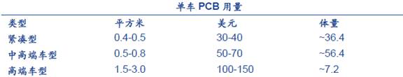 3)產(chǎn)業(yè)鏈調(diào)研數(shù)據(jù)顯示,目前汽車電子占比超過10%,單車PCB 價值量顯著提升。