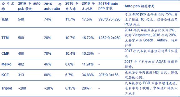 在車載PCB 領(lǐng)域,全球前5 名汽車PCB 制造商分別為敬鵬、TTM、CMK、Meiko 以及KCE。根據(jù)敬鵬2016 年年報,臺灣敬鵬位列第一,2016 年公司實(shí)現(xiàn)主營業(yè)務(wù)收入7.41 億美元,其中汽車PCB 板占比74%達(dá)5.48 億美元,專注汽車PCB 板,全球市場份額約為11.7%,其他PCB 廠也奮起直追,臺灣廠商中健鼎14Q1 公司汽車板業(yè)務(wù)占比13.2%,17Q1 占比21.4%,位居全臺第二,全球占比5%-6%;耀華在ADAS 領(lǐng)域節(jié)節(jié)高升(主要是ADAS 的長短距雷達(dá)板,今年有望實(shí)現(xiàn)倍數(shù)增長),汽車板業(yè)務(wù)占比首次超過30%。國內(nèi)PCB 企業(yè)不甘落后,滬電股份表示在新產(chǎn)品方面,公司24GHz 汽車高頻雷達(dá)用PCB 產(chǎn)品以及新能源汽車電池管理系統(tǒng)(BMS)用PCB 產(chǎn)品已實(shí)現(xiàn)穩(wěn)定供貨。根據(jù)公司公告,目前依頓電子的汽車業(yè)務(wù)占比由2016 年的27%上升至33%,公司的毛利率水平顯著提高也是系產(chǎn)品結(jié)構(gòu)的調(diào)整,同時公司的募投項目也逐漸投產(chǎn),均用來生產(chǎn)汽車板,未來業(yè)績值得期待。