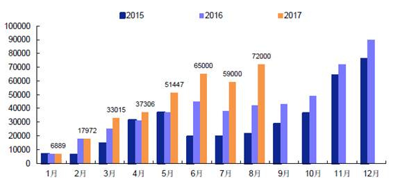 2015年-2017年8月我國新能源汽車產(chǎn)量(臺)(來源:中汽協(xié))