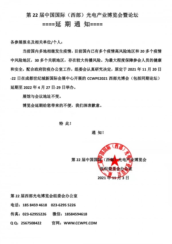 中國國際(西部)光電產(chǎn)業(yè)博覽會(簡稱:CCWPE或西部光電博覽會)將于2022年4月27日至29日在成都世紀(jì)城新國際會展中心舉辦。西部光電博覽會是目前我國中西部地區(qū)歷史最...