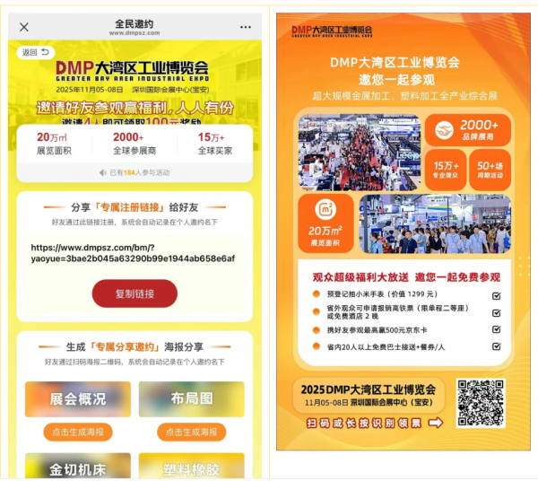 DMP工博會(huì)特別重視買家團(tuán)的招募與接待工作,旨在通過(guò)精準(zhǔn)邀約對(duì)接行業(yè)規(guī)上企業(yè)買家團(tuán),提升展會(huì)效果及影響力,助力參展企業(yè)業(yè)務(wù)轉(zhuǎn)化。為了顯示誠(chéng)意,讓買家參觀無(wú)后顧之憂,愉快地看看這場(chǎng)扎根制造業(yè)27年,背靠行業(yè)知名品牌、掌握龐大市場(chǎng)銷售及應(yīng)用渠道、行業(yè)創(chuàng)新引領(lǐng)者的行業(yè)頭部展會(huì),辦得怎么樣,帶來(lái)什么驚喜?!為此,我們?cè)诩扔懈@A(chǔ)上,為朋友們推出更多更新更實(shí)用福利活動(dòng)!