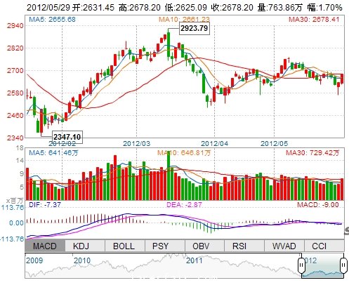 今 開: 2631.45 最 高: 2678.20 最 低: 2625.09 振 幅: 2.02% 昨 收: 2633.42 成交量: 7638620手 成交額: 999216.48萬 換手率: --