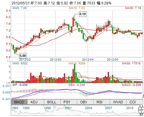 今 開: 7.00 成交量: 7633手 振 幅: 2.84% 最 高: 7.12 成交額: 538.53萬 換手率: 0.44% 最 低: 6.92 總市值: 12.26億 市凈率: 3.03 昨 收: 7.04 流通市值: ...
