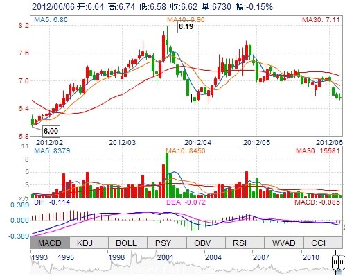 今 開(kāi): 6.64 成交量: 6730手 振 幅: 2.41% 最 高: 6.74 成交額: 446.42萬(wàn) 換手率: 0.39% 最 低: 6.58 總市值: 11.50億 市凈率: 2.84 昨 收: 6.63 流通市值: ...