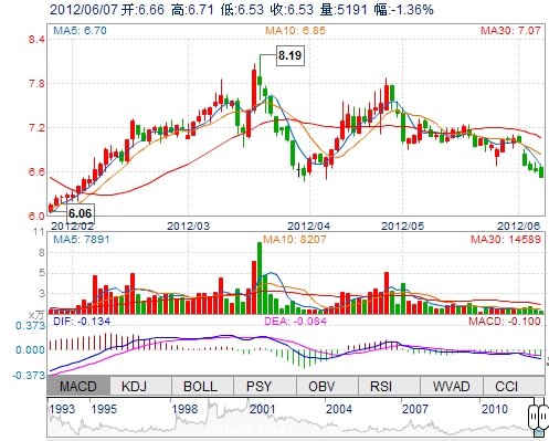 今 開: 6.66 成交量: 5191手 振 幅: 2.72% 最 高: 6.71 成交額: 343.33萬 換手率: 0.30% 最 低: 6.53 總市值: 11.34億 市凈率: 2.80 昨 收: 6.62 流通市值: ...