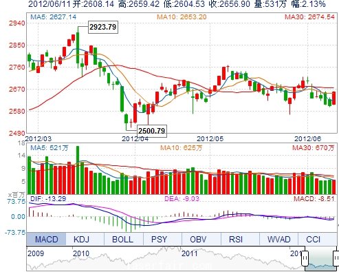 今 開: 2608.14 最 高: 2659.42 最 低: 2604.53 振 幅: 2.11% 昨 收: 2601.57 成交量: 5308870手 成交額: 782276.61萬 換手率: --