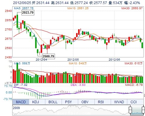 今 開: 2631.44 最 高: 2631.44 最 低: 2577.24 振 幅: 2.05% 昨 收: 2641.72 成交量: 5337439手 成交額: 685642.06萬 換手率: --