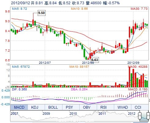 今 開: 8.81 成交量: 48600手 振 幅: 3.64% 最 高: 8.84 成交額: 4211.15萬 換手率: 2.50% 最 低: 8.52 總市值: 17.39億 市凈率: 3.55 昨 收: 8.78 流通市值...
