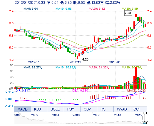 | 最 高: | 6.54 | 成交額: | 1.20億元 | 換手率: | 2.08% |