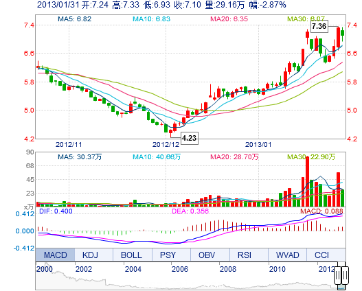 今開: 7.24 成交量: 29.16萬手 振幅: 5.47% 最高: 7.33 成交額: 2.08億元 換手率: 3.27% 最低: 6.93 總市值: 63.27億 市凈率: 2.42 昨收: 7.31 流通市值: 63...