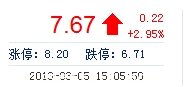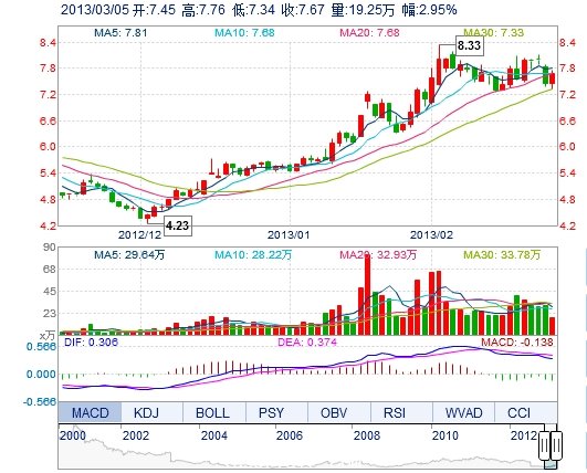 今開: 7.45 成交量: 19.25萬手 振幅: 5.64% 最高: 7.76 成交額: 1.46億元 換手率: 2.16% 最低: 7.34 總市值: 68.35億 市凈率: 2.62 昨收: 7.45 流通市值: 68...