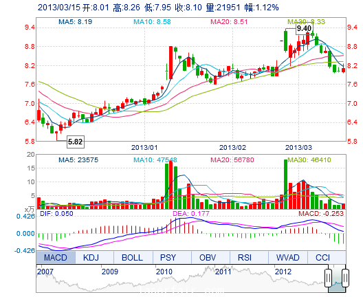 今 開: 8.01 成交量: 2.20萬手 振 幅: 3.87% 最 高: 8.26 成交額: 1784.31萬元 換手率: 1.13% 最 低: 7.95 總市值: 16.14億 市凈率: 3.25 昨 收: 8.01 流通市...