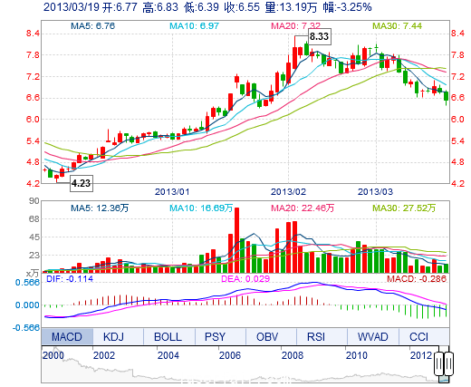 | 今 開(kāi): | 6.77 | 成交量: | 13.19萬(wàn)手 | 振 幅: | 6.50% |