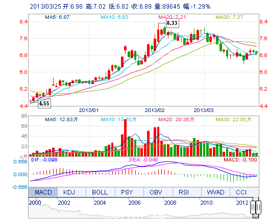 | 今 開: | 6.98 | 成交量: | 8.96萬手 | 振 幅: | 2.87% |