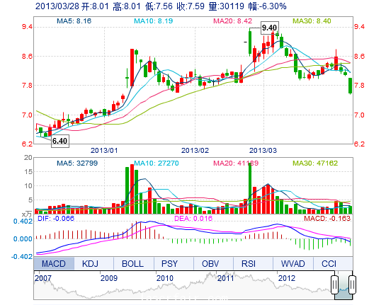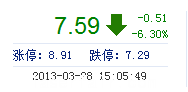 | 今 開: | 8.01 | 成交量: | 3.01萬手 | 振 幅: | 5.56% |