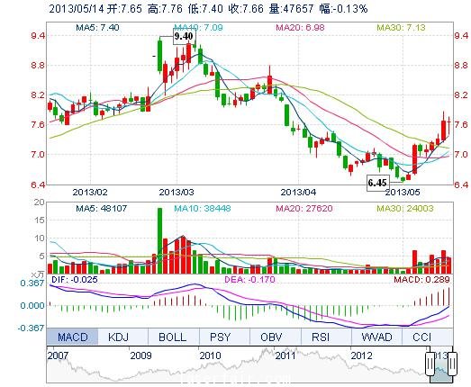 今開: 7.65 成交量: 4.77萬手 振幅: 4.69% 最高: 7.76 成交額: 3619.76萬元 換手率: 2.45% 最低: 7.40 總市值: 15.26億 市凈率: 3.15 昨收: 7.67 流通市值: ...