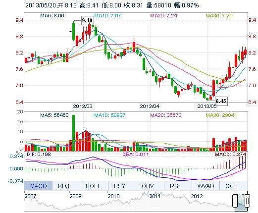 今開: 8.13 成交量: 5.80萬手 振幅: 4.98% 最高: 8.41 成交額: 4750.92萬元 換手率: 2.99% 最低: 8.00 總市值: 16.56億 市凈率: 3.42 昨收: 8.23 流通市值: ...