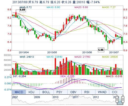 | 今 開: | 6.79 | 成交量: | 2.00萬手 | 振 幅: | 8.68% |