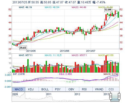 今開: 50.55 成交量: 10.48萬手 振幅: 7.43% 最高: 50.85 成交額: 5.08億元 換手率: 3.65% 最低: 47.07 總市值: 140.11億 市凈率: 9.80 昨收: 50.86 流通市值...