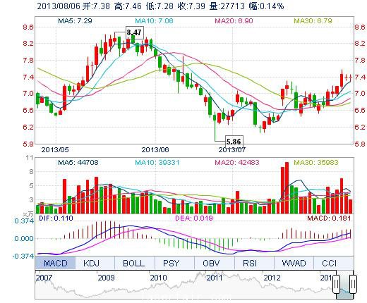 今開: 7.38 成交量: 2.77萬手 振幅: 2.44% 最高: 7.46 成交額: 2043.35萬元 換手率: 1.43% 最低: 7.28 總市值: 14.72億 市凈率: 3.04 昨收: 7.38 流通市值: ...