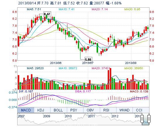 今開: 7.70 成交量: 2.81萬手 振幅: 3.74% 最高: 7.81 成交額: 2147.08萬元 換手率: 1.45% 最低: 7.52 總市值: 15.18億 市凈率: 3.14 昨收: 7.75 流通市值: ...