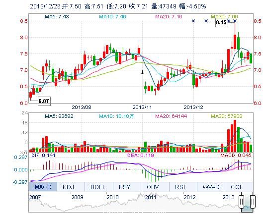 今開: 7.50 成交量: 4.73萬手 振幅: 4.11% 最高: 7.51 成交額: 3466.35萬元 換手率: 2.38% 最低: 7.20 總市值: 14.37億 市凈率: 2.93 昨收: 7.55 流通市值: ...