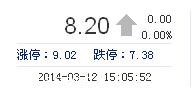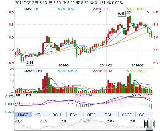 今開: 8.13 成交量: 3.12萬手 振幅: 4.76% 最高: 8.39 成交額: 2553.00萬元 換手率: 1.56% 最低: 8.00 總市值: 16.34億 市凈率: 3.33 昨收: 8.20 流通市值: ...