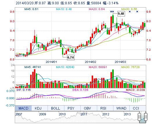 今開: 8.87 成交量: 5.89萬手 振幅: 3.92% 最高: 9.00 成交額: 5178.76萬元 換手率: 2.96% 最低: 8.65 總市值: 17.23億 市凈率: 3.51 昨收: 8.93 流通市值: ...