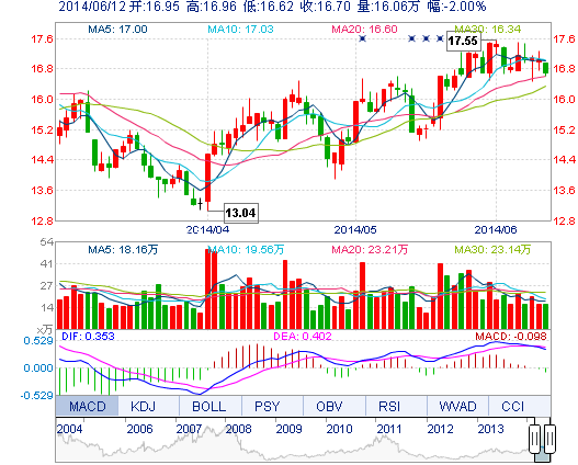 今開: 16.95 成交量: 16.06萬手 振幅: 2.00% 最高: 16.96 成交額: 2.69億元 換手率: 1.68% 最低: 16.62 總市值: 176.27億 市凈率: 4.78 昨收: 17.04 流通市值...