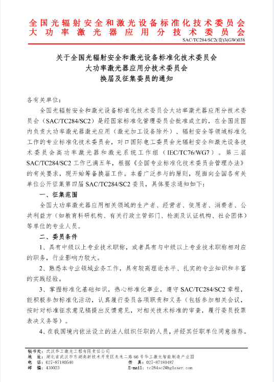 SAC/TC284/SC2大功率激光器應(yīng)用分技術(shù)委員會(huì) 關(guān)于征集第四屆委員的通知