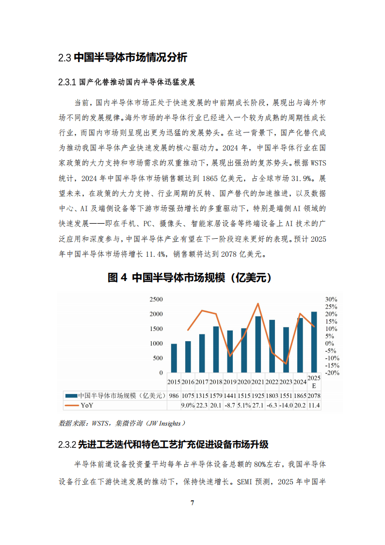 全球半導(dǎo)體市場穩(wěn)步增長,2024年規(guī)模達(dá)6272億美元,2025年預(yù)計(jì)增至7280億美元,AI算力需求成為核心驅(qū)動(dòng)力。半導(dǎo)體設(shè)備市場同步升溫,2025年全球制造設(shè)備銷售額預(yù)計(jì)達(dá)1255億美元。中國市場表現(xiàn)突出,2024年半導(dǎo)體市場銷售額占全球31.9%,2025年預(yù)計(jì)增長至2078億美元,半導(dǎo)體設(shè)備市場規(guī)模有望達(dá)2899.3億元,前道設(shè)備和封裝設(shè)備市場均呈增長態(tài)勢,國內(nèi)頭部晶圓廠和封測廠商積極擴(kuò)產(chǎn),帶動(dòng)設(shè)備需求激增。