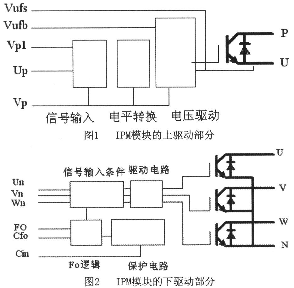 如上圖所示,圖1為IPM模塊的上驅(qū)動(dòng)部分,圖2為IPM模塊的下驅(qū)動(dòng)部分。一個(gè)完整的DIP-IPM模塊包括三個(gè)上驅(qū)動(dòng)部分和一個(gè)下驅(qū)動(dòng)部分,在圖1中給出的只是U相的驅(qū)動(dòng)電路,V、W相與U相的電路完全相同。下面就結(jié)合內(nèi)部結(jié)構(gòu)對(duì)模塊進(jìn)行說(shuō)明。
