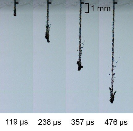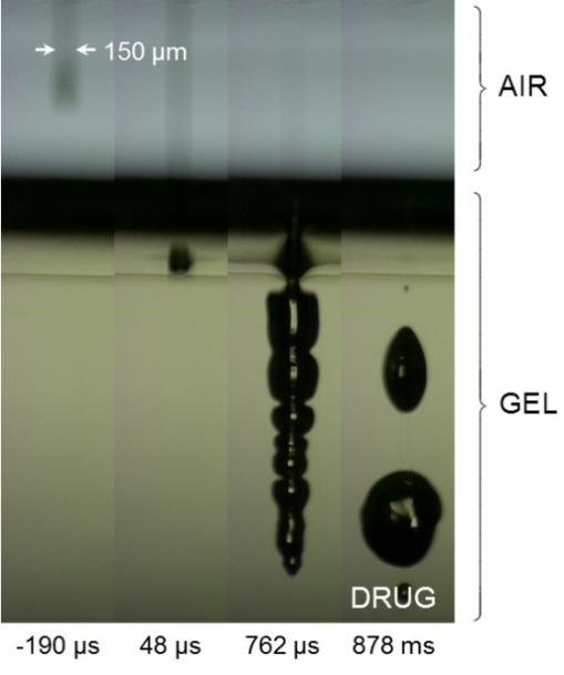 每次激光脈沖僅持續(xù)1/4000秒,在推進液體中產生蒸汽泡沫,泡沫的壓力在水和藥物之間的薄膜上產生彈性應變,導致藥物能夠從微型噴管中強有力地噴射出來。藥物噴流的直徑僅有150微米,比人體頭發(fā)的直徑略大一點。
